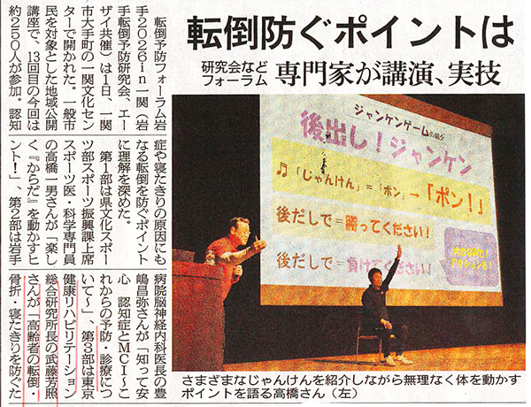 3月1日(日)に一関市文化大ホールで開催された「岩手転倒予防フォーラム2026 in 一関」(共催:岩手転倒予防研究会、エーザイ株式会社 / 協力:日本転倒予防学会) の模様が、3月2日(火)付の岩手日日新聞で紹介されました。
